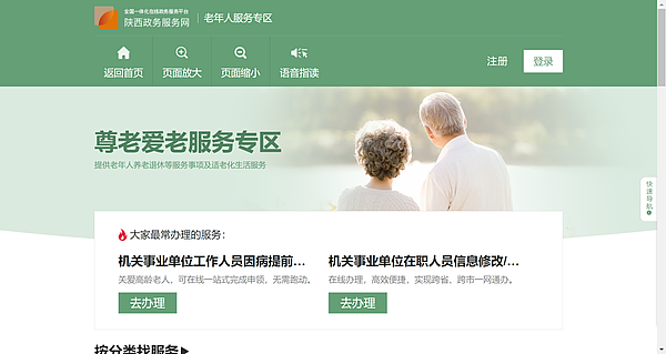 為(wèi)更好(hǎo)的(de)服務老(lǎo)年(nián)群衆,西(&™xī)安市(shì)政務服務網設立“尊老(lǎo)專區(qū)”,更∞÷₩₩好(hǎo)的(de)解決了(le)老(lǎo)年(nián)群衆因視(shφ∑ì)力問(wèn)題,導緻網上(shàng)辦事(sh∏♥ì)難的(de)問(wèn)題。