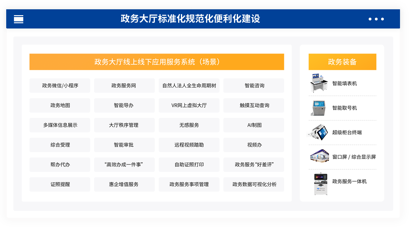 深化(huà)國(guó)家(jiā)政策Ω™₹↕解讀(dú)和(hé)文(wén)件(jiàn)指€₩導,全面按要(yào)求部署實施落地(dì),提供¶→<“互聯網+政務服務”綜合解決方案,構建線上Ω☆'(shàng)線下(xià)O2O一(yīβ<)體(tǐ)化(huà)政務服務平台,助力實現(xiàn)“一(yī)号一(y ≤ī)窗(chuāng)一(yī)網”。